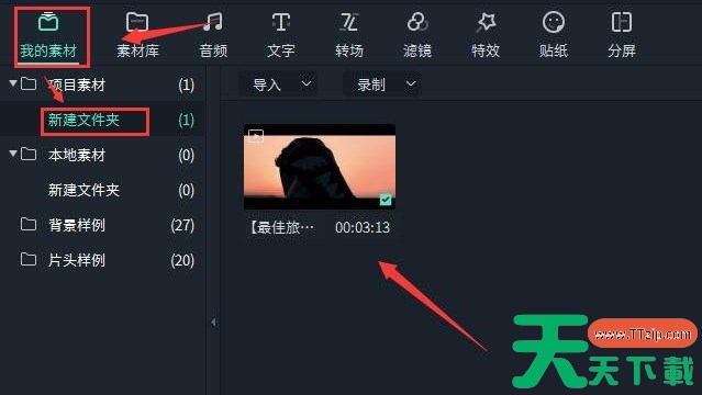 1.首先,打开万兴喵影软件界面后,找到左上角的我的素材菜单,在新建文件夹栏目中导入素材文件