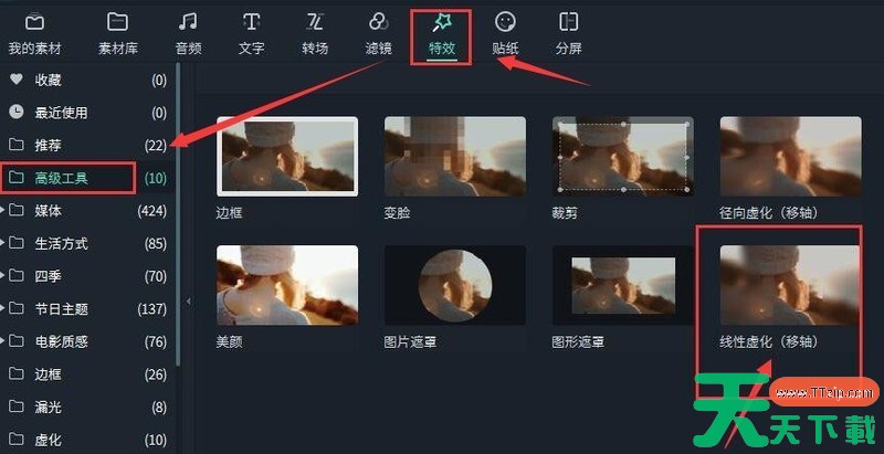 2.点击特效菜单,选择高级工具选项中的线性虚化(移轴)效果