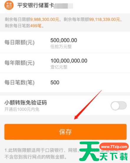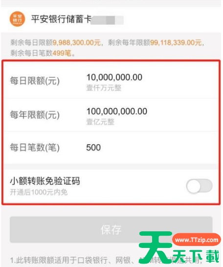 打开口袋银行【我的】 点击【银行卡】 点击【转账限额设置】 输入新的限额金额 点击【保存】 输入手机验证码及取款密码 设置成功 @天天资源网TTzip 除特别注明外,本站所有文章均为 天天下载 原创,转载请注明出处来自 https://www.ttzip.com/210743.html
