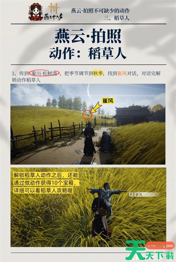燕云十六声中隐藏动作摘星辰、问月舞、稻草人与学鸟飞都要怎么获得呢?下面请看为大家带来的燕云十六声4个隐藏动作获取攻略,希望可以帮助到大家。
