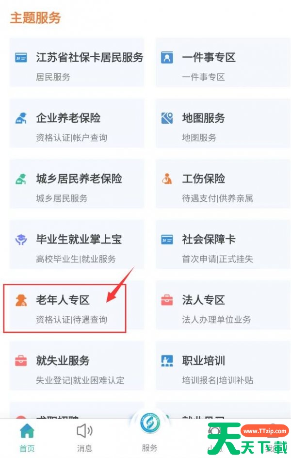 2、打开下载江苏智慧人社APP,选中“老年人专区”。