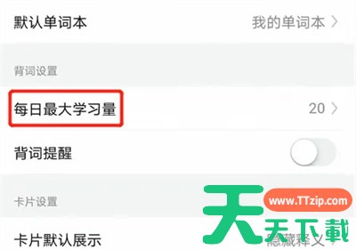 4.在设置页面里“背词设置”下方的选项中有一个“每日最大学习量”,在它的后面点击当前设置的学习量进入。