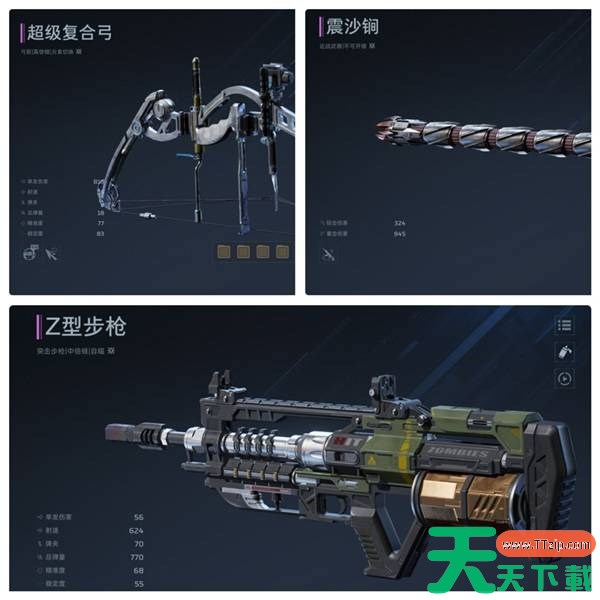 步枪是紫色武器,相对好获取,培养难度低,步枪做为入门首选,可见Z型步枪泛用性相当强。复合弓自带两个技能,主要是一技能进入狂热射击状态,期间使用武器射击会自动消耗后备弹药,且射速提高。震沙锏带技能可以提升角色造成的物理伤害,和步枪十分搭配。