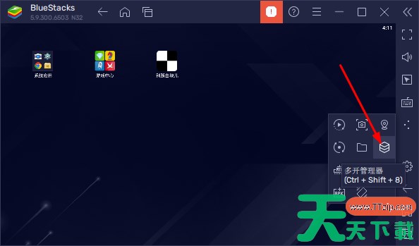 1、首先点开右侧的3个点图标,如图红色箭头指的图标,然后就会出来多开管理器选项。 2、点击图片中红色箭头指的多开引擎按钮来创建一个新的多开引擎。 3、然后我们选择全新多开引擎或多开并复制应用。 4、就可以开始体验多开带来的游戏啦体验啦。 以上就是蓝叠模拟器怎么多开游戏 蓝叠模拟器游戏多开操作方法的详细内容,希望对您有所帮助。 除特别注明外,本站所有文章均为 天天下载 原创,转载请注明出处来自 https://www.ttzip.com/210884.html