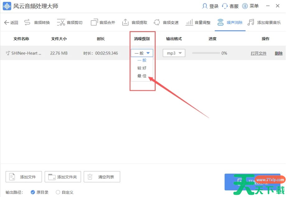 3、在软件界面上,找到已导入的音频文件,并点击其后面的“消噪级别”选项。在弹出的下拉菜单中,选择“一般”、“较好”或“最佳”中的一个选项。