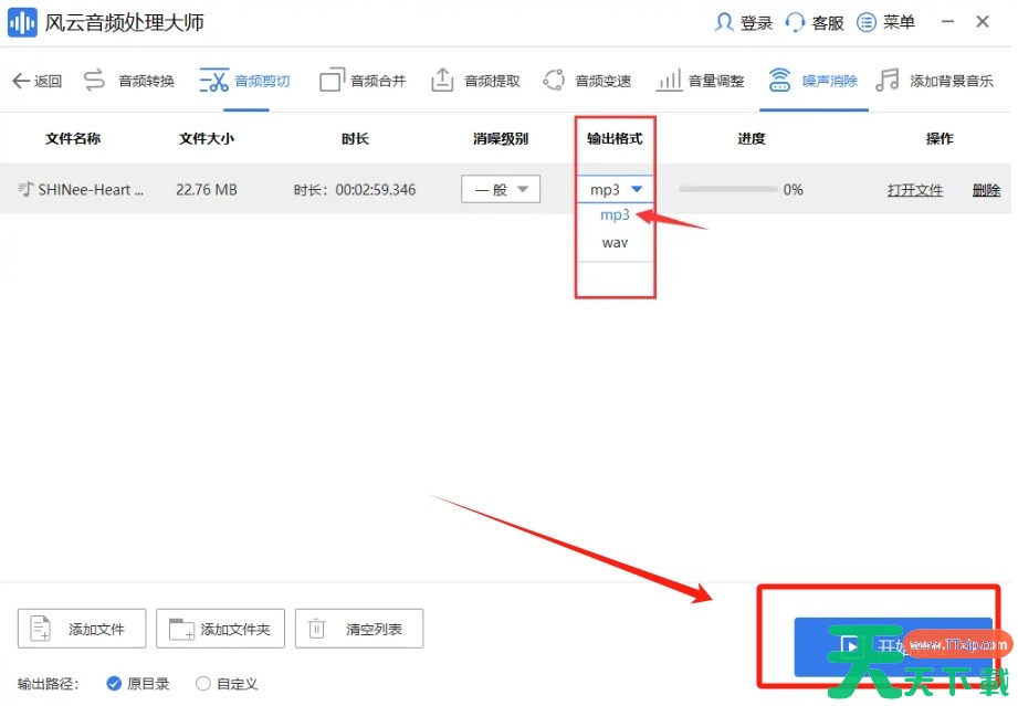 4、在“输出格式”选项中,您可以选择将处理后的音频文件保存为MP3或WAV格式。设置完成后点击“开始处理”即可。