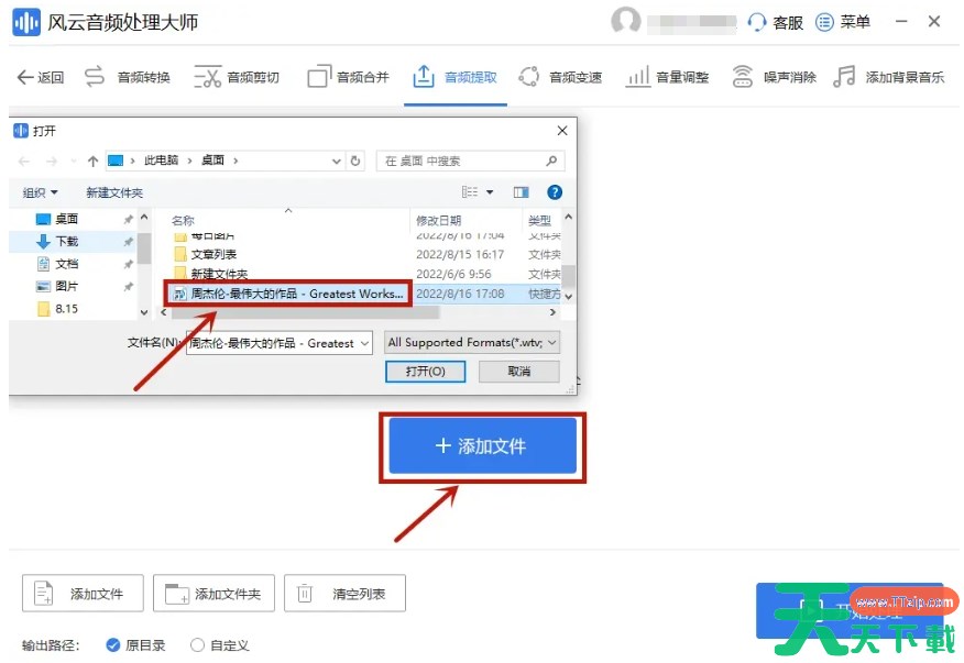 2、点击“添加文件”按钮,从电脑本地中找到并添加您需要提取音频的视频或音频文件。