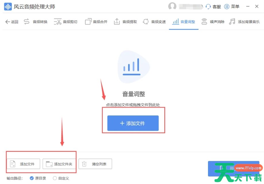 2、在软件中间界面找到并点击“添加文件”按钮,或者可以直接将需要处理的音频文件拖拽到软件界面上。