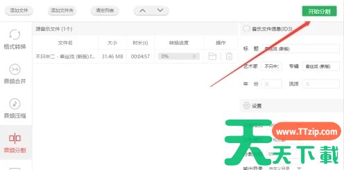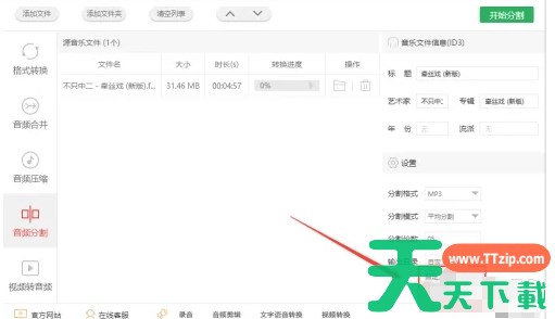闪电音频格式转换器是一款功能全面、操作简便、高效实用的音频转换软件,适用于各种音频处理需求。如果您需要进行音频格式转换或音频合并等操作,不妨试试这款软件。支持多种音频格式之间的转换,用户可以根据需要将wav、ogg、flac、amr、m4a等格式的音频转换为mp3或其他所需格式。接下来就让天天下载Ttzip为大家解答一下闪电音频格式转换器怎么对音频分割处理以及闪电音频格式转换器对音频分割处理的方法吧!