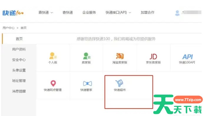 1、点击进入快递100电脑版软件,在用户中心页面,找到并点击“快递超市”选项。