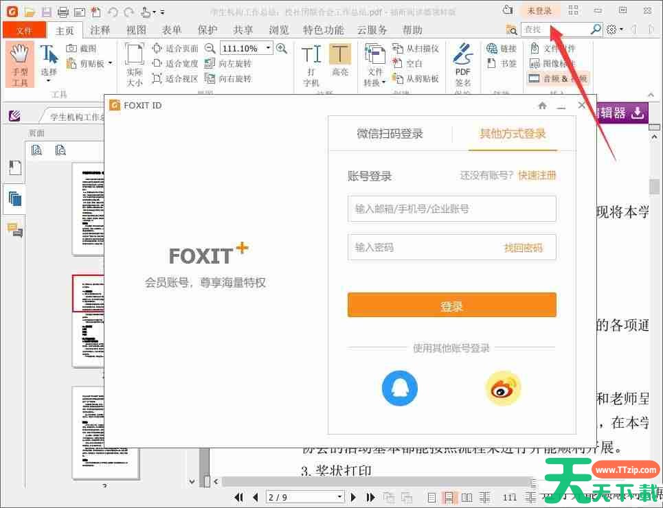 2、点击右上角的未登录,登录或注册福昕会员账号,在福昕阅读器领鲜版中使用PDF合并、PDF拆分等高级功能需要登录。
