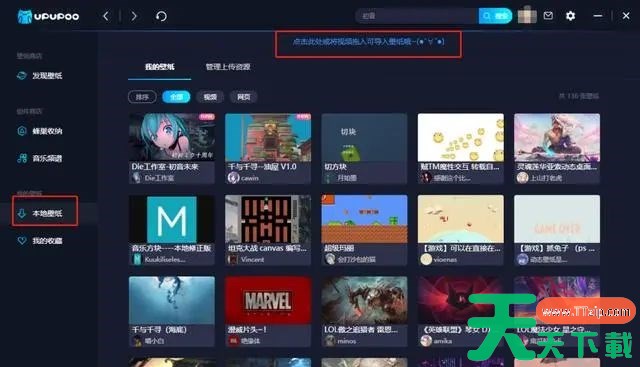 一、进入“本地壁纸”,点击软件搜索框下的“点击此处或将视频拖入可导入壁纸”。
