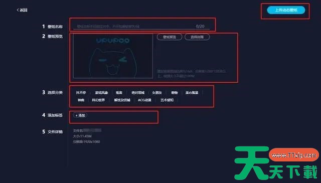 四、在上传页面按要求填写“壁纸名称”、“壁纸预览”图、“分类”、“标签”,点击右上角的“上传壁纸”就上传成功了。