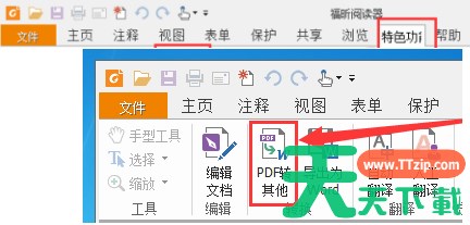先启动福昕PDF阅读器,接着在顶部工具栏找到“特色功能”,然后选择“PDF转其他”功能。