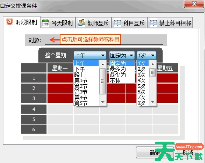 2、弹出的自定义条件窗口有五种条件可供设置:时段限制、各天限制、教师互斥、科目互斥和禁止科目相邻。在排课界面中,找到语文科目的排课区域。根据学校的作息时间表和课程安排需求,为语文课设置具体的时间。