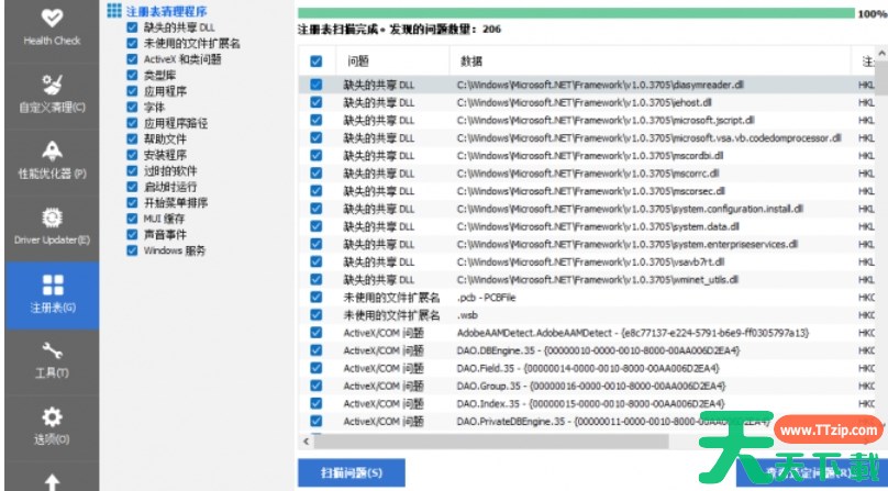 打开ccleaner软件,并在左侧功能菜单中点击切换至“注册表”操作界面。在注册表清理工具列表中,根据需要勾选对应的清理工具,然后点击“扫描问题”按钮。ccleaner将开始扫描注册表并列出存在的问题。