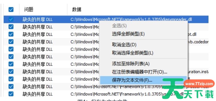 在问题列表中,查看“数据”列以了解每个问题相关的程序。确认目标文件后,右击问题条目,在右键快捷菜单中选择“保存为文本文件”。