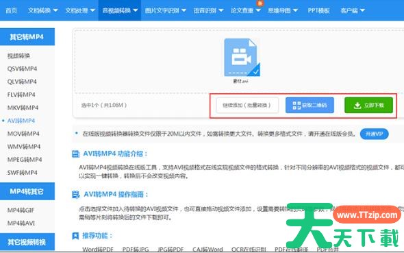 2、添加AVI文件,添加完成,网站会自动转换;点击【继续添加】,可以添加多个AVI文件,进行批量转换,点击【立即下载】,可以保存转换之后的MP4文件。