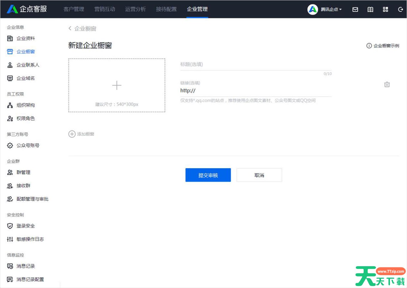 2、上传图片、填写标题和链接,最多可新建2个企业橱窗,点击【提交审核】