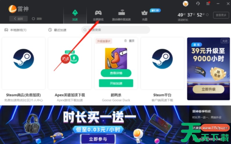 1、打开雷神加速器,在首页点击“全部游戏”。 2、然后点击“平台游戏下载”。 3、可以在雷神加速器的搜索框中输入你想要下载的游戏名称,进行下载即可。 以上就是天天下载Ttzip为您整理的雷神加速器怎么下载游戏?雷神加速器下载游戏的操作流程啦,希望能帮到您。 除特别注明外,本站所有文章均为 天天下载 原创,转载请注明出处来自 https://www.ttzip.com/211148.html