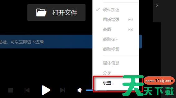 1.将迅雷影音打开之后,我们将页面进行右键点击,在旁边出现的菜单选项中,将【设置】选项进行点击一下。