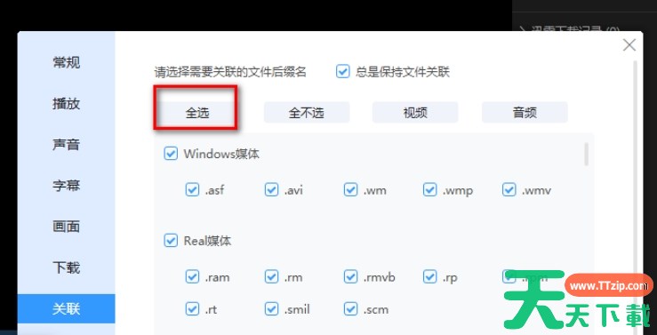 3.随后,我们即可在关联的窗口中查看到可以关联的文件后缀名,你可以点击【全选】按钮,将所有的后缀名都进行选中,或者根据自己的需求只选择其中需要的文件名即可。
