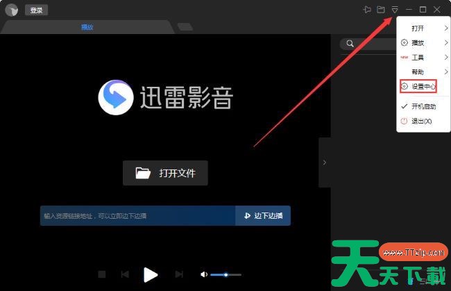 1、点击软件右上角的倒三角按钮,接着选择下方选项列表中的"设置中心"。