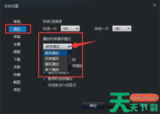 2、在打开的窗口界面中,点击左侧栏中的"播放"选项,然后找到右侧中的"播放列表循环模式",点击选项框的下拉按钮,在下方给出的选项列表中选择"循环播放",最后点击"确定"保存即可。