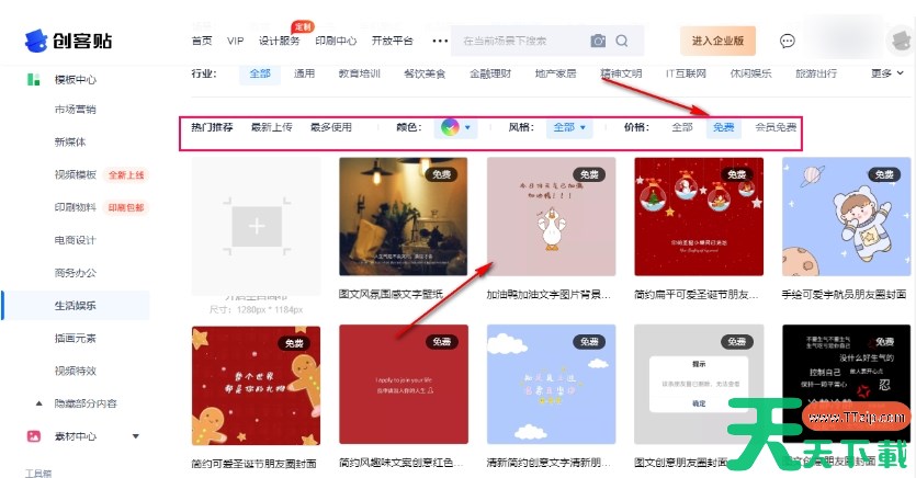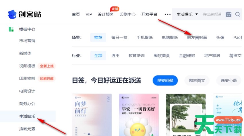 创客贴是一个全能好用的图片编辑器和视频剪辑工具,那么创客贴怎么做朋友圈封面?创客贴做朋友圈封面的方法?下面就让天天下载Ttzip给大家解答下吧! 创客贴怎么做朋友圈封面? 1、打开创客贴软件,在创客贴页面左侧的模板中心列表中选择“生活娱乐”选项,然后点击”朋友圈封面“。 2、在朋友圈封面模板页面中,浏览并选择一个你喜欢的模板。 3、然后根据您的需求进行内容编辑,设置好了点击下载保存即可。 以上就是天天下载Ttzip为您整理的创客贴怎么做朋友圈封面?创客贴做朋友圈封面的方法啦,希望能帮到您。 除特别注明外,本站所有文章均为 天天下载 原创,转载请注明出处来自 https://www.ttzip.com/211184.html