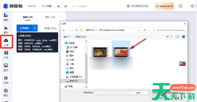 2、在创客贴的设计页面中,点击“上传”选项,在弹出的文件选择窗口中,浏览并选中您想要剪辑的视频文件,然后点击“打开”将其上传到创客贴中。