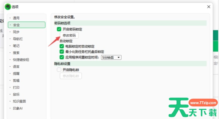 以上,就是天天下载Ttzip为大家总结的关于印象笔记更改密码锁的密码的步骤介绍了,希望能够对大家有所帮助。