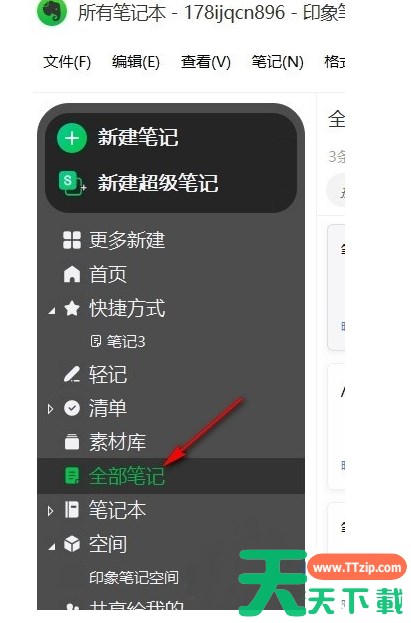 1、打开印象笔记,在页面左侧找到【全部笔记】一栏;
