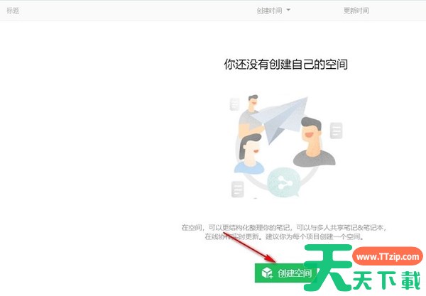 2、随后,在右侧的界面中,点击【创建空间】,在空间里,我们可以更结构化整理笔记,可以与多人共享笔记和笔记本,在线协作实时更新,我们可以为每一个项目创建一个空间;