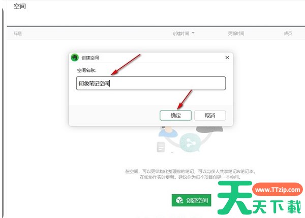 3、随后,在弹出的窗口中编辑一个空间名称,点击确定;