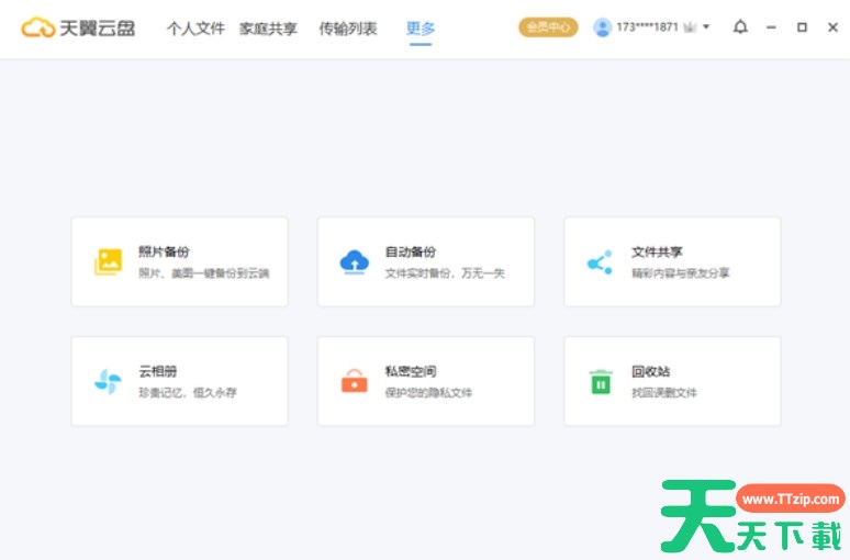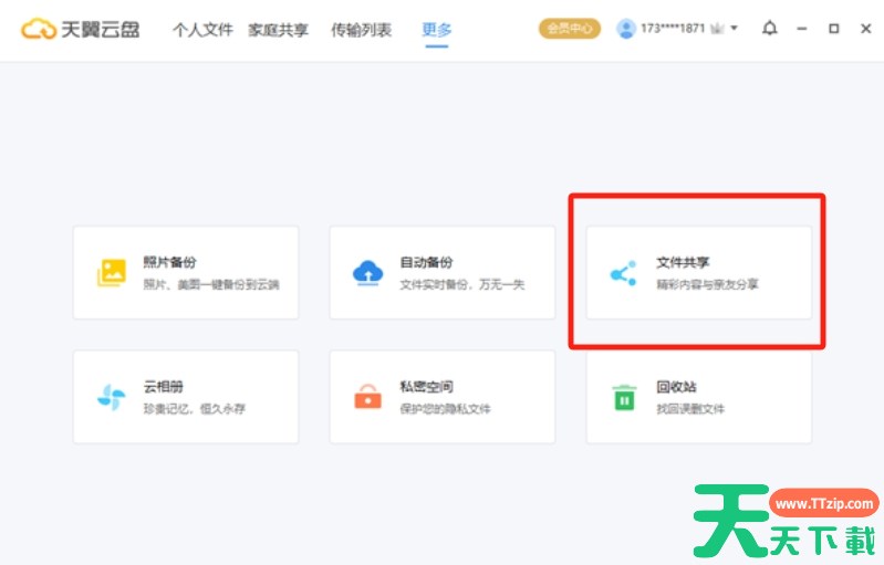 天翼云盘是一款为用户提供跨平台的文件存储、备份、同步及分享服务的免费网盘,那么天翼云盘怎么文件共享?天翼云盘文件共享的方法?下面就让天天下载Ttzip给大家解答下吧! 天翼云盘怎么文件共享? 1、打开么天翼云盘软件,在主页点击“更多”选择。 2、然后选择“文件共享”选项,接着选择您想要共享的文件进行共享即可。 以上就是天天下载Ttzip为您整理的天翼云盘怎么文件共享?天翼云盘文件共享的方法啦,希望能帮到您。 除特别注明外,本站所有文章均为 天天下载 原创,转载请注明出处来自 https://www.ttzip.com/211241.html