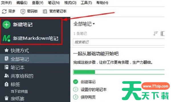 1、打开印象笔记,在左上角找到【新建笔记】或者是【新建MarkDown笔记】,都可以;