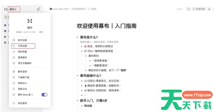 幕布软件是一款实用的思维导图软件,那么幕布软件如何切换深色模式?幕布软件切换深色模式的方法?下面就让天天下载Ttzip给大家解答下吧! 幕布软件如何切换深色模式? 1、点击用户名称:打开幕布软件,首先点击界面左上角的用户名称。在弹出的下拉列表中,选择“外观设置”选项。 2、切换深色模式:在外观设置页面中,找到主题设置部分,然后选择“深色模式”。完成选择后,幕布界面将自动切换到深色模式。 以上就是天天下载Ttzip为您整理的幕布软件如何切换深色模式?幕布软件切换深色模式的方法啦,希望能帮到您。 除特别注明外,本站所有文章均为 天天下载 原创,转载请注明出处来自 https://www.ttzip.com/211270.html