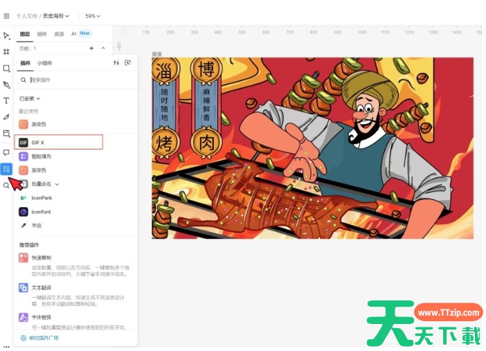 2、进入设计工作台后,在左侧的工具栏中找到插件的图标,点击后会出现已安装的插件列表。找到并打开GIF X插件。