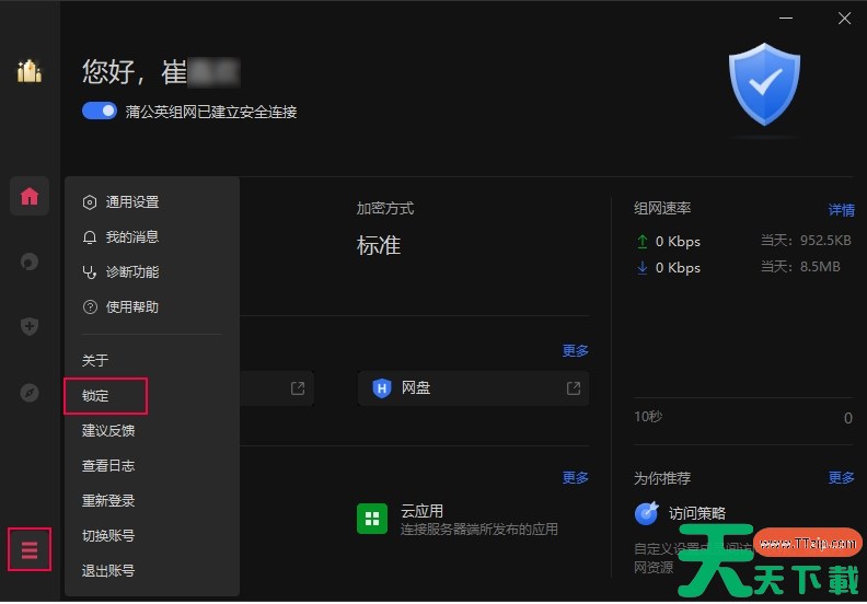 蒲公英是一款专业可靠的智能组网软件,那么蒲公英软件怎么进行锁定?蒲公英软件锁定的操作流程?下面就让天天下载Ttzip给大家解答下吧! 蒲公英软件怎么进行锁定? 1、打开蒲公英软件,在蒲公英客户端软件的左侧菜单栏中点击“三条杠”设置按钮,然后选择“锁定”选项。 2、然后就可以进行锁定了,解锁需要手机手机验证码解锁。 以上就是天天下载Ttzip为您整理的蒲公英软件怎么进行锁定?蒲公英软件锁定的操作流程啦,希望能帮到您。 除特别注明外,本站所有文章均为 天天下载 原创,转载请注明出处来自 https://www.ttzip.com/211328.html