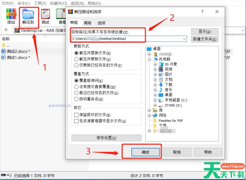 1、打开WinRAR,选择【解压到】,在新的对话框里,选择解压后存放文件的新文件夹,再点击【确定】。