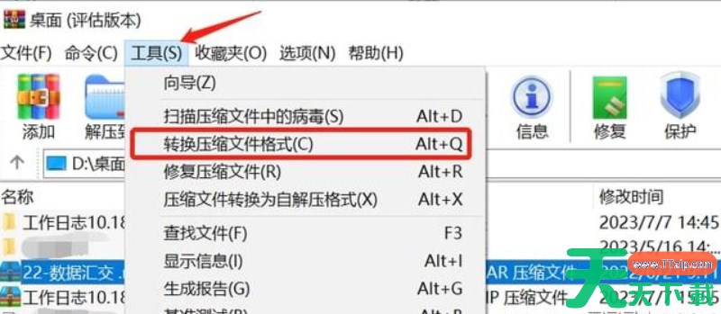打开WinRAR,选中需要转换格式的rar压缩包,然后选择工具栏中的工具,找到【转换压缩文件格式】功能。