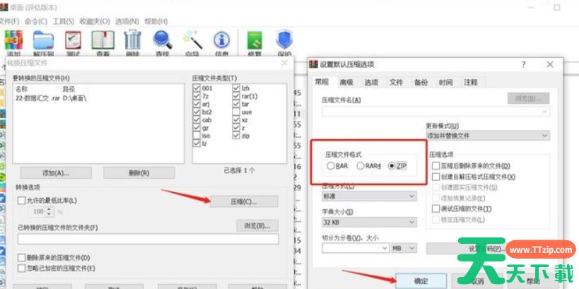在转换界面中,我们可以直接点击压缩按钮(也可以继续添加想要转换格式的压缩包),在压缩界面选择想要转换的格式,比如zip,然后点击确定,WinRAR就会自动将rar文件解压出来然后再自动将文件压缩为zip格式的压缩包。