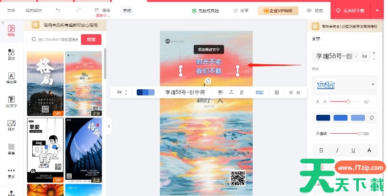 进入编辑页面后,直接点击模板上的文字部分进行编辑。输入或粘贴自己的文案内容,并在右侧的文字编辑栏中调整字体、大小、颜色等属性。