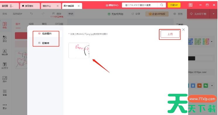 找到模板中的二维码或其他想要替换的图片元素。双击该图片,通常会弹出图片替换窗口。选择【上传】按钮,从本地选择自己的图片进行替换,或者从左侧的背景库中选择推荐的图片。