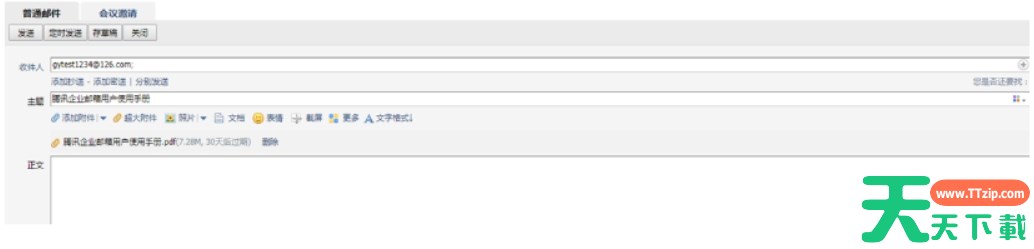 确定后,您可以看到要发送的文件已经成为该邮件的附件。请检查好收件人、主题,并写好正文后,就可以发送了。