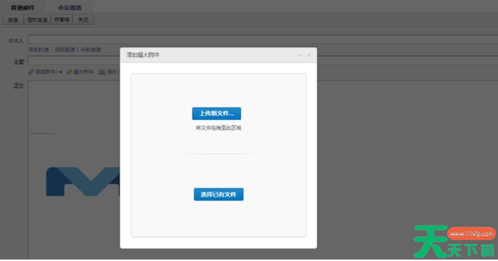 第二种方法:直接进入写信界面,填写好收件人、主题。点击“超大附件”,可以选择“新文件”,也可以选择中转站或者企业网盘中已有的文件。