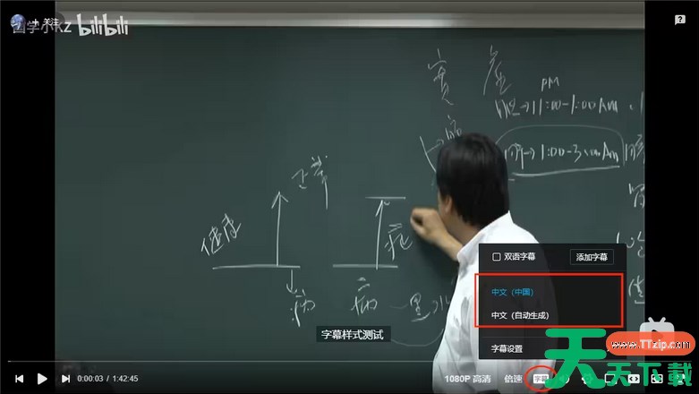 如图所示,如果该视频有字幕的话,在倍速右边、音量左边会有一个字幕选项,鼠标放上去便会弹出选择窗口。