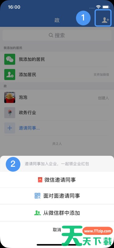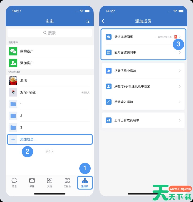 1.在【通讯录】底部或右上角,找到“添加成员”,可微信邀请同事或者面对面邀请同事。