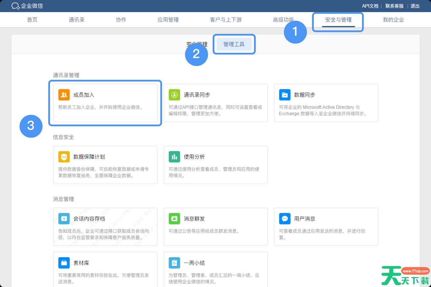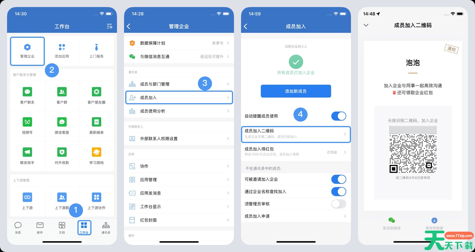 2.在【手机端->管理企业->成员加入->成员加入二维码】,保存该二维码,可以直接分享至同事群,也可以打印出来,放在公司前台。