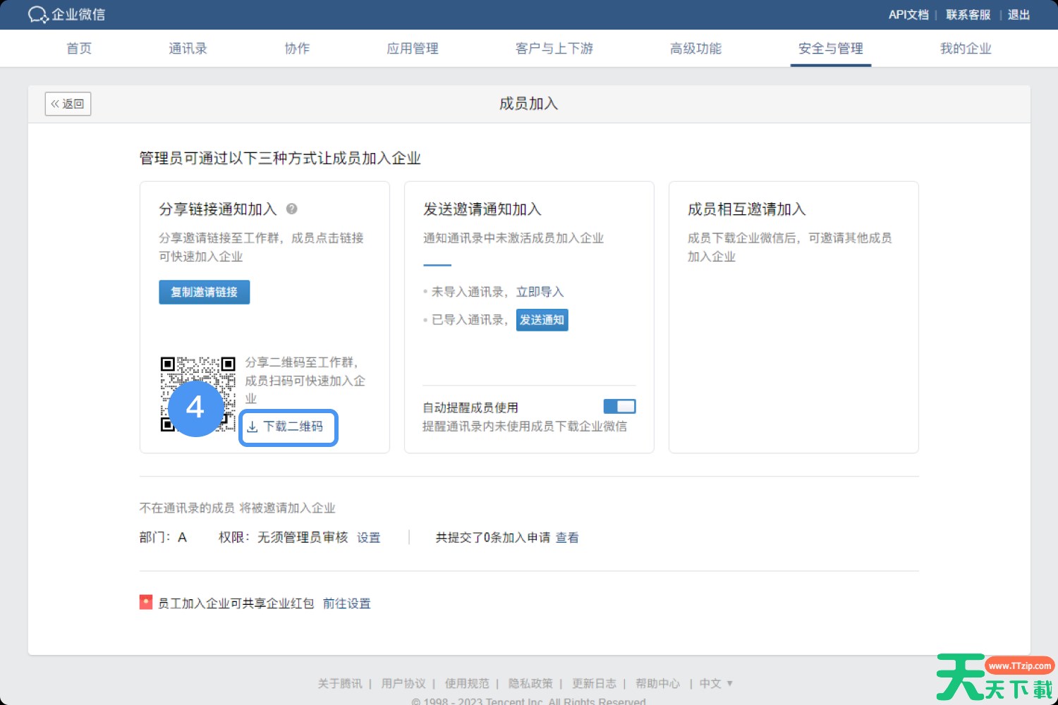 3.在【管理后台->安全与管理->管理工具->成员加入->分享链接/二维码通知加入】,链接和二维码的有效时间是365天,企业微信移动端成员加入二维码是7天有效期。